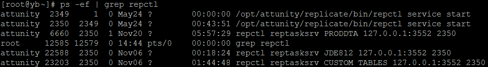 The running replication tasks are the processes that start repctl reptasksrv <TASK_NAME>. In the example above there are 3 running tasks: