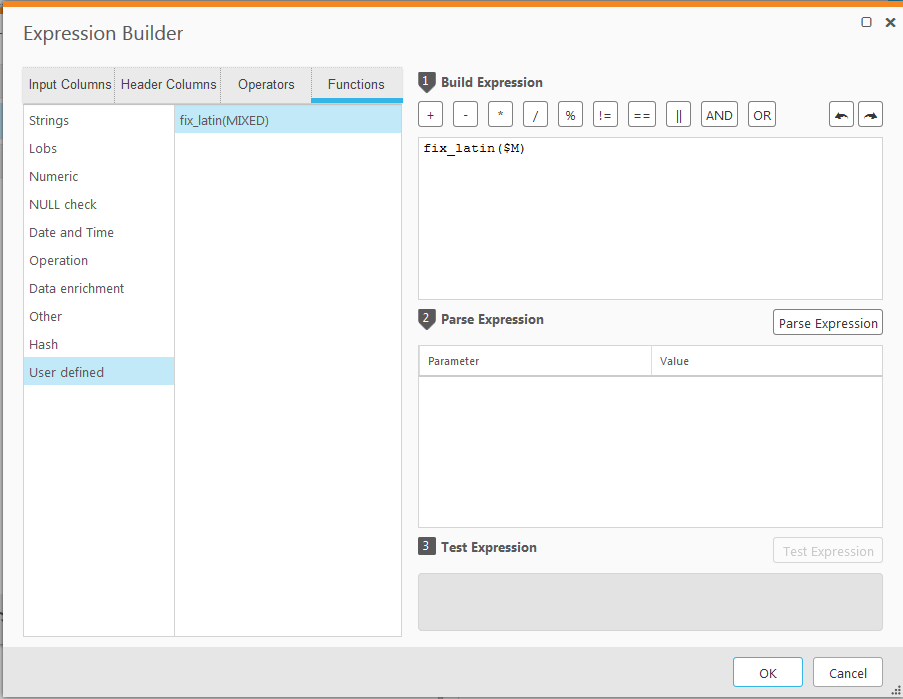 Use the fix_latin function available on the Functions tab under User defined. Reference the source column that needs to be transformed as input to the function (M in the example below).