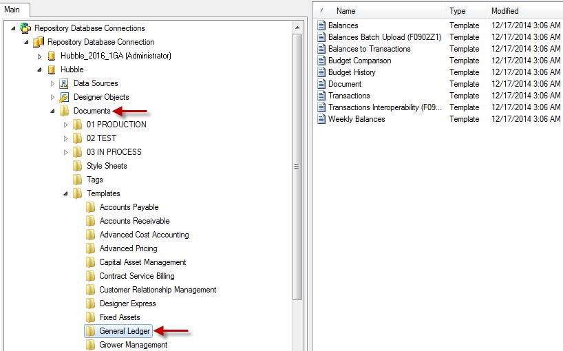 - Collapse the Import/Export Folder, expand Documents > Templates in the designated repository and highlight the folder into which you wish to put the templates (in this case the General Ledger folder).