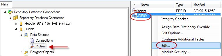 - If any profiles have been imported, go through the profile wizard again, making sure all tests are completed successfully. The profile wizard can be access by right-clicking the individual profile, in this example JDE90, and then selecting Edit: