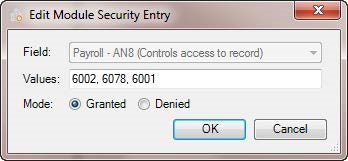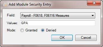 In this example, we are going to restrict the Administrator group from viewing the Gross Pay value column (GPA). In the Add Module Security Entry dialog: