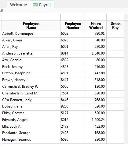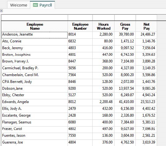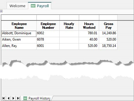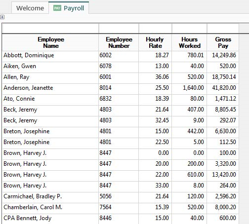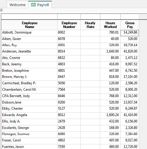 Some fields can be set to suppress the display of sensitive information from a user. In this example we will suppress the display of Hourly Rate, a label column found with the Payroll History Template. Before any security is applied, the inquiry looks like this:
