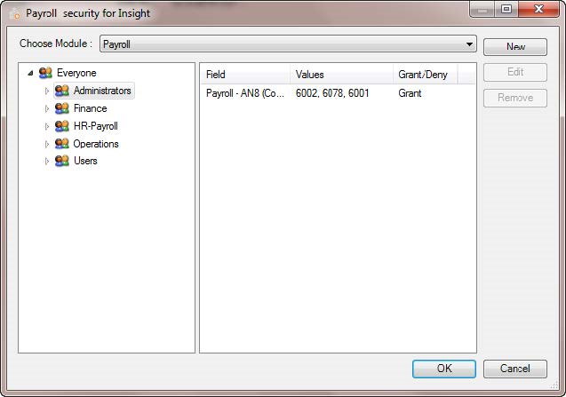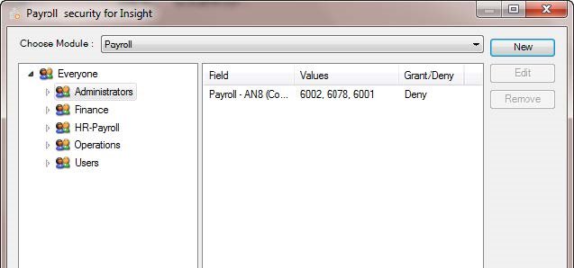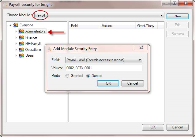 In Administrator, we will apply security to the Administrator Group as shown below. This will affect all users within this group. We selected the Payroll Module at the top of the dialog, then selected the