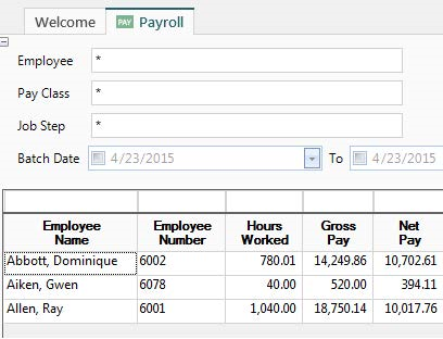 As a result of the Module Security setting, the Gross Pay column, although specified in the filter, will no longer be displayed to users in the Administrator Group as shown below: