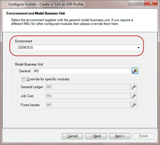 - Click Next in the Profile Wizard until you get to the Environment and Model Business Unit screen.