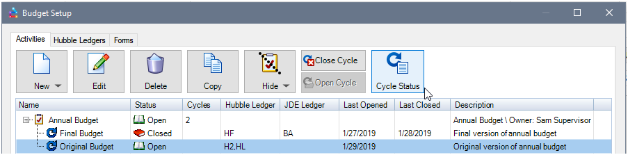 Expand the activity to view the cycle and then highlight the cycle. Then click Cycle Status