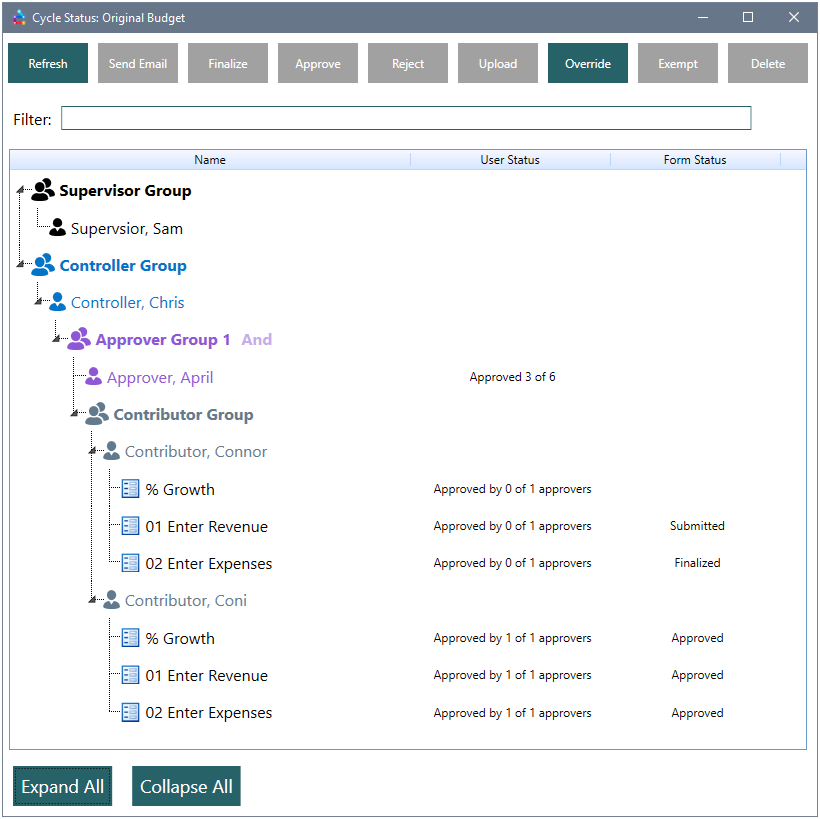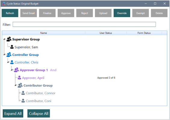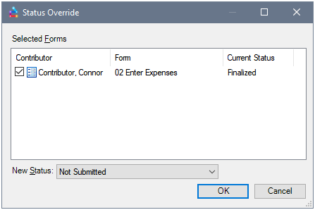 Supervisors and Controllers have the power to ‘unapprove’ a form for a Contributor in case a mistake has been made. This is done within the Cycle Status dialog by selecting the desired Group, Participant, or Form and clicking Override. From this dialog, you can change the Form Status to Not Submitted, Submitted, Finalized, or Approved.