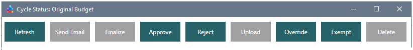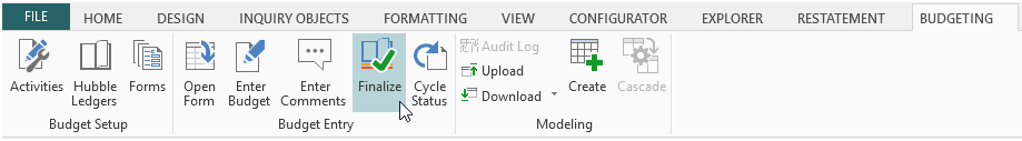 Once data input is complete, the Contributor can finalize the submission. Once Finalized, the Contributor will not be able to access Enter Budget Mode or make further changes. The form can be finalized via the Budgeting Menu or through the Cycle Status dialog.