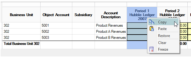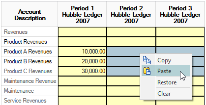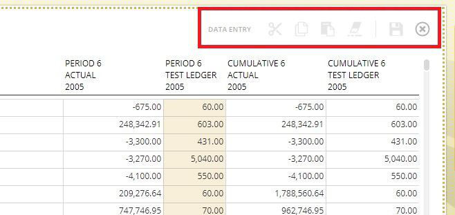 Users can paste a cell or selection of cells into a highlighted group of cells while in Enter Budget Mode. This action can be performed on a single cell, range of cells, or entire columns by selecting the column header.