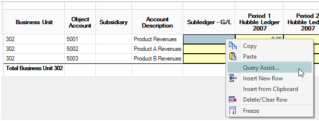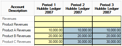 - The cells must be a unique combination of the Hubble Ledger and the dimensions required by your ERP such as Business Unit, Object Account, Subsidiary Account, Year and Period. See Input Form Requirements for more information.