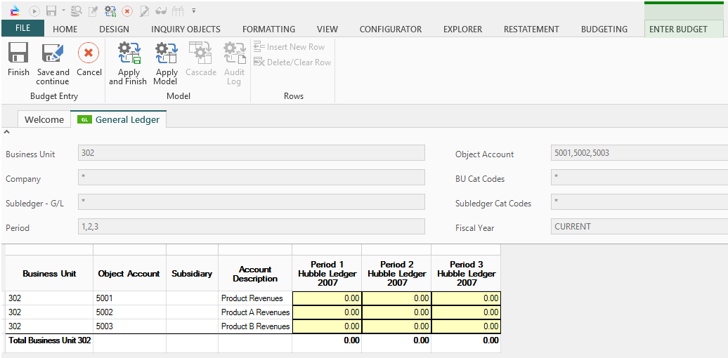 Contributors can enter amounts, via Enter Budget Mode, into Hubble Inquiries that have been designated as Budget Form. Data can be input directly into Hubble Ledgers or you can use formulas via modeling to input the data.