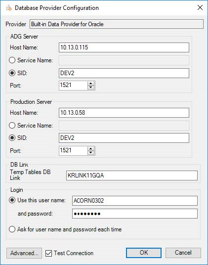 - The settings in the Database Provider Configuration dialog will vary depending on the type of source database the connection is located in (the example above is of the dialog if the Oracle ADG source type was selected).