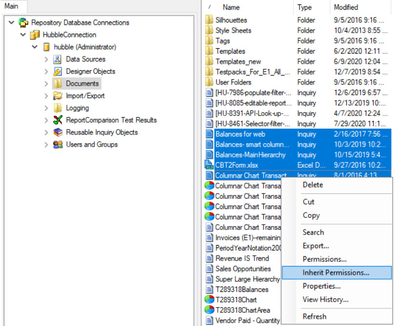 While Permissions are used in Hubble to manage which users can do what with inquiries and folders, in Administrator they are also used for any saved objects such as Connections, Profiles, documents, folders and Reusable Inquiry Objects. You can assign Permissions at the individual or group level.