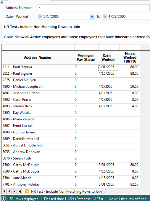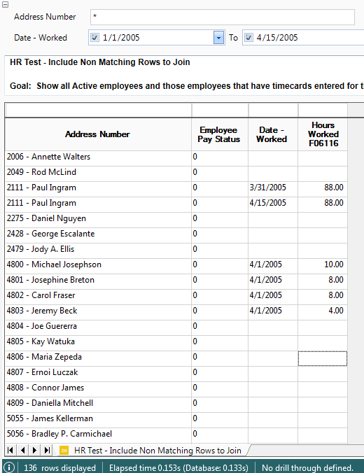 - Change the filter to include nulls. This shows active employees with timecards between 1/1/2005 and 4/15/2005