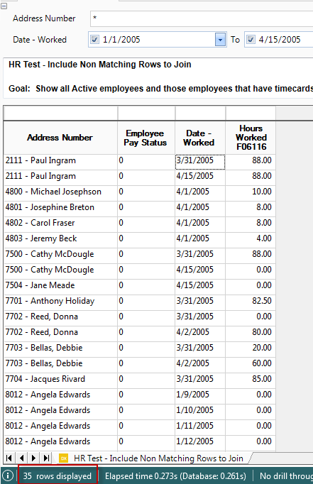 When filtering on Date Worked from the F06116, we only get active employees who have a timecard record for 1/1/2005 through 4/15/2015. 35 rows are returned: