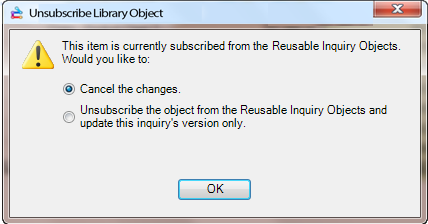 - Unsubscribe the object from the Reusable Inquiry Objects and update this inquiry’s version only: Change the current value in the inquiry and unsubscribe the selector from RIO, meaning other reports subscribed to the selector will not reflect any change.