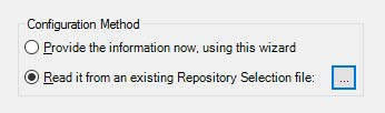 - In the Choose Configuration Method step, choose Read it from an existing Repository Selection file and then navigate to the saved .xml file by selecting the radio button and clicking the "…" button. (The .xml file is commonly found within the Hubble install directory.)