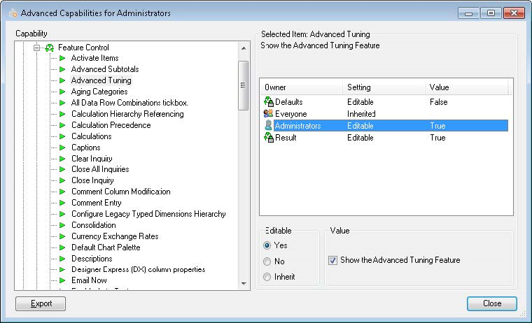 For example, navigate to Feature Control> Advanced Tuning Capability, which is used for viewing the SQL statement within Hubble. In the Owner section, we are setting it at the Everyone level. Select Editable = Yes and activate the option to Show the Advanced Tuning Feature: