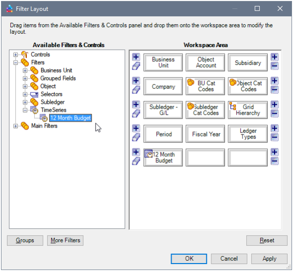 - From the Available Filters & Controls, expand the Time Series section and Select “12 Month Budget” and drag it to an empty space in the workspace area.