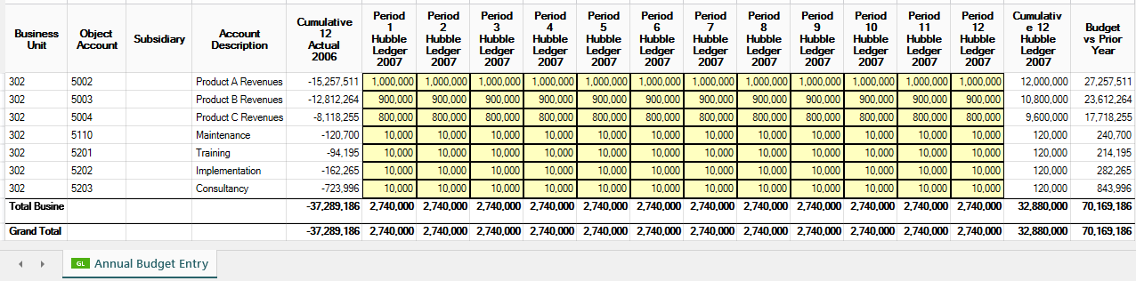 This example will demonstrate the ability to create an Annual Budget Input Form from the GL Balances Template. The Input Form will utilize a single Time Series to bring in the Cumulative of Prior Year Actuals alongside 12 Months of the Budgeting Year. A Hubble Calculation will also be created to compare the Prior Year Actuals to the Total of the Budgeting Year.