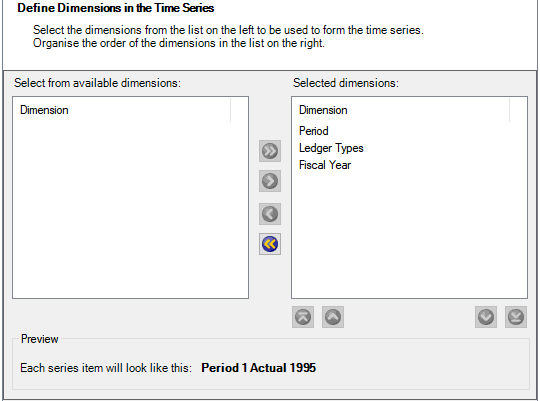 - Select the following dimensions and list in this order: Period, Ledger Types, and Fiscal Year. Click Next.