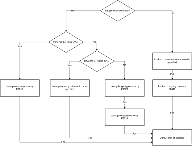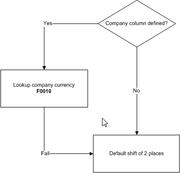 F0025 for E1 and F0005 World); the decimal shift will be determined by the Ledger Type (LT/ F0025 or F0005), Currency Code (CRCX/F0025 or F0005) and the Display Decimals (CDEC/F0013) combination.