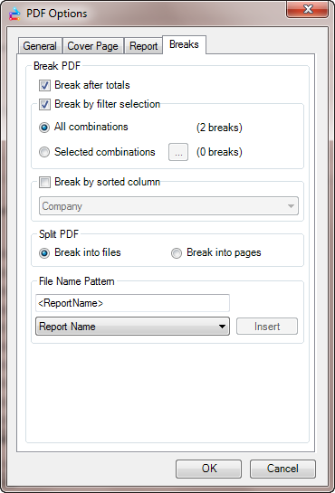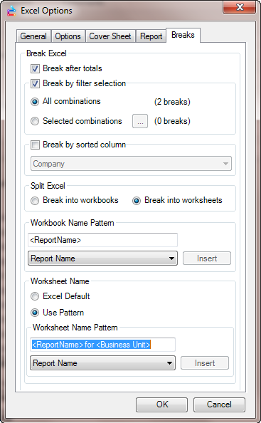 Report bursting, which is the ability to create separate documents based on filter criteria, is honored when outputting a report using Scheduler. It is important to note that when breaking into multiple files either in Excel or PDF, the File Name Pattern as set in Scheduler takes precedence over the settings in Excel Options or PDF Options.