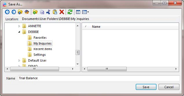 If the inquiry has not been previously saved, you are presented with the Save Inquiry As dialog. By default, this dialog initially opens within your own ‘My Inquiries’ folder. To save an inquiry, provide an inquiry name by typing the desired name and clicking Save.