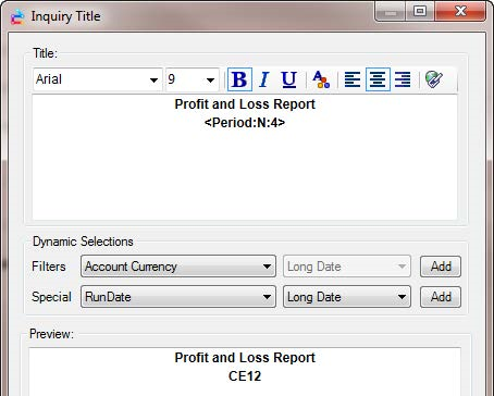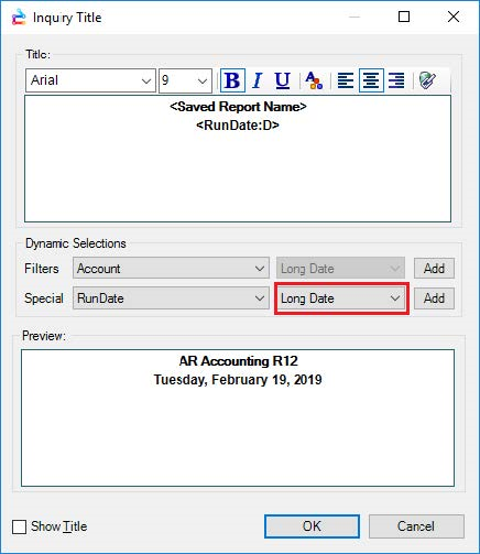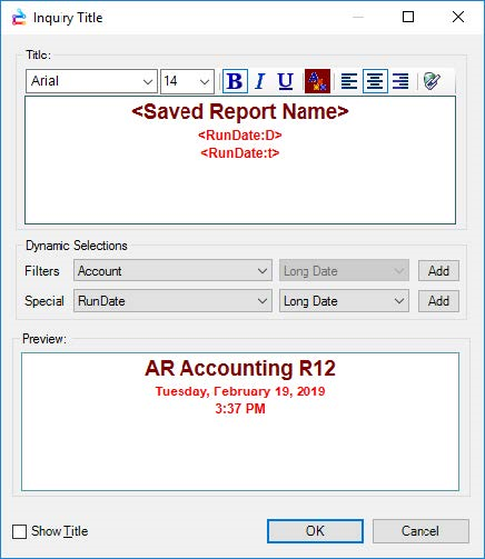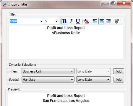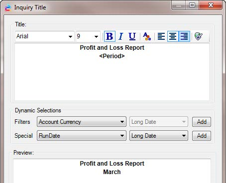 Static text is text that always stays the same, whereas dynamic text is based on filter selection and updates according to the filter selections. For example, if you select the dynamic selection of <Period> in the title, each time the Period filter data changes, the title will be dynamically updated to display that period. If you filter on the period of March, the title would display “March”; if you filter on the period of April, the title would update to show “April”. In the Inquiry Title dialog, any dynamic text is denoted with the < > characters.