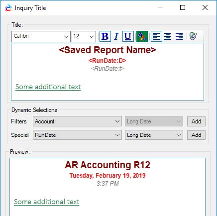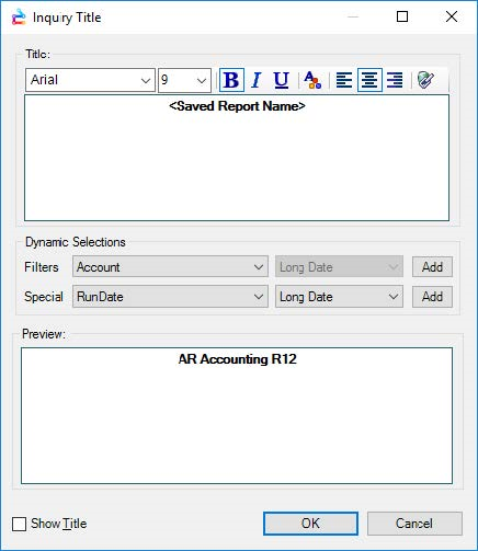 - The default title is <Saved Report Name>, which dynamically updates according to the saved inquiry name. This can be removed, if desired, to create a different title.