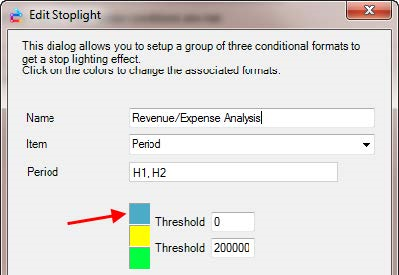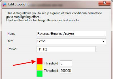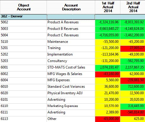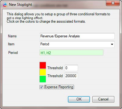 For example, use the Stoplight feature to highlight half-year revenue and expense figures within a Business Unit. Highlight the following ranges: