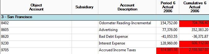 Object accounts 5002, 5003 and 5004 are correctly formatted in green as they are Revenues. Object Account 5110 is correctly coded as its value is negative, but is less than the Threshold level of 200,000