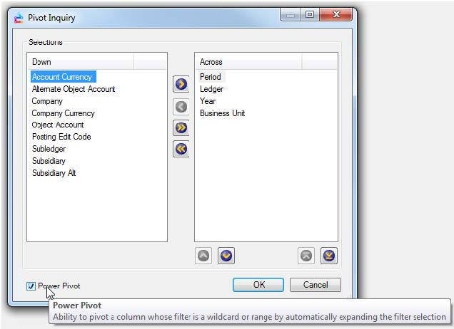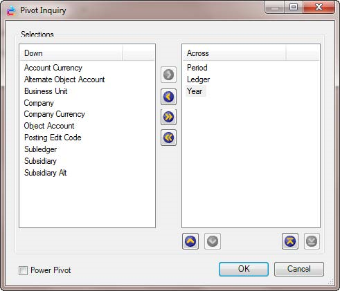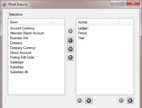 - To change the order of the pivoted fields, in the Pivot Inquiry dialog, highlight the dimension to move and use the up/down/top/bottom buttons to re-sequence the fields.