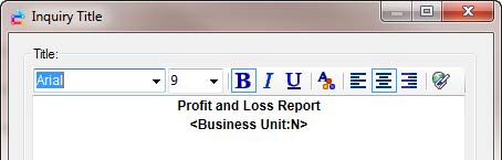 The below example on a Profit and Loss report shows the static text “Profit and Loss Report” on the first line, and on the second line the Business Unit filter is a dynamic selection. In this case, there are two business unit values in the Business Unit filter, so both display in the actual title: