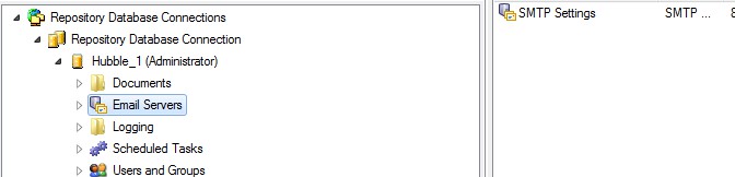 Once configured, you will see the SMTP Settings on the right panel when the Email Servers folder on the left is highlighted: