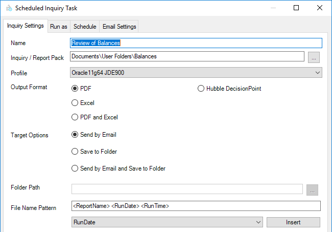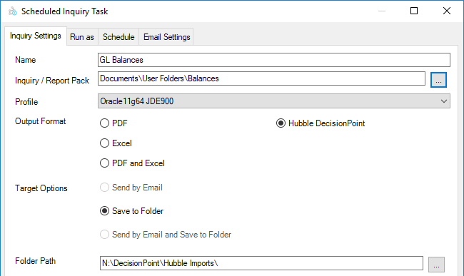 Reports can be exported to a DecisionPoint format. When creating a new Scheduled Inquiry Task, choose the Hubble DecisionPoint Output Format. DecisionPoint files can only be outputted via the Save To Folder Target Option.