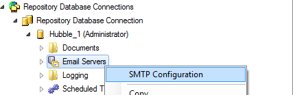 To configure the SMTP settings in order to be able to allow the sending of emails through the application, right-click on Email Servers and choose SMTP Configuration: