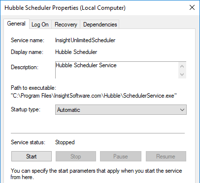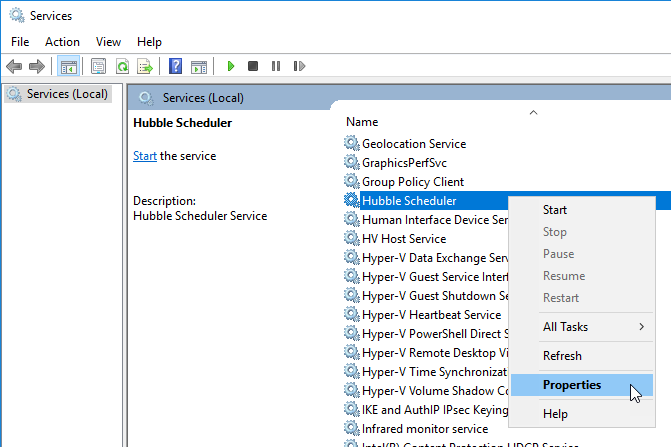 Go to Windows Services, right-click on Hubble Scheduler, and select Properties.