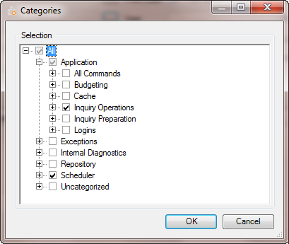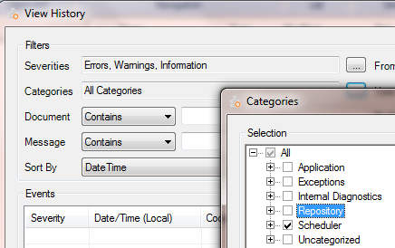Once View History is selected, set filter data as needed. Within the Scheduler Application, only Scheduler-specific messages are displayed. However within Administrator, to narrow down to Scheduler events, you need to change Categories to only select Scheduler as shown below.