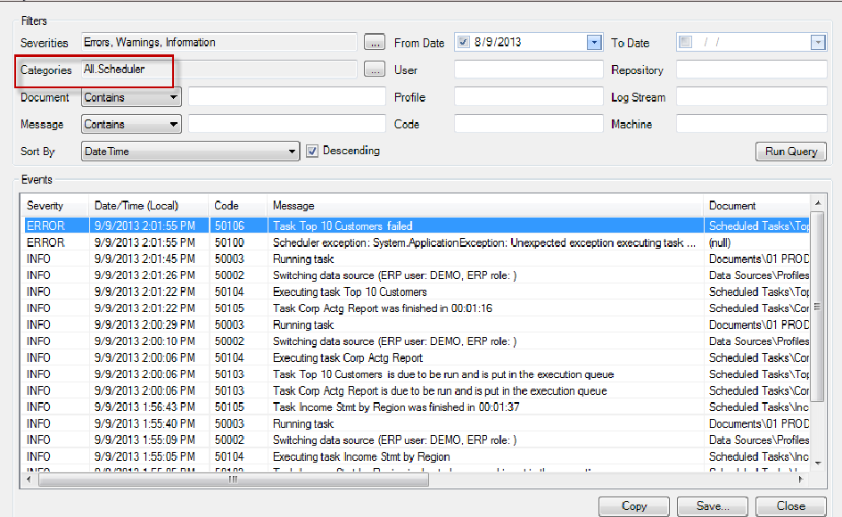 After running the query, you will see the Scheduler Events. In the screenshot below, you can see the event according to its corresponding message: Windows Services started, scheduled inquiry task put in the execution queue and later started, data source switched, task run, task finished and email output.