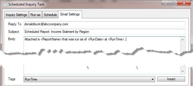 Tags – dynamic information that you can insert into the body of the email. Note that on tags, the run date/run time comes from the server that the Service is installed on. It will be different than the date/time defined in the Schedule tab if the server is in a different time zone than that of the local machine.