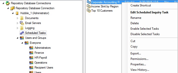 Scheduled tasks can be edited, deleted, renamed, disabled and enabled. To do any of these functions, highlight Scheduled Tasks in the left panel of Scheduler. Right-click on the specific task in the right panel and select the desired function.