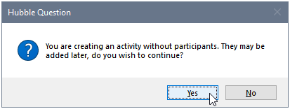 - Press OK to save the Activity. Note, if you press OK prior without defining at least one participant, the following notification will appear. Press Yes to continue creating the activity without participants.