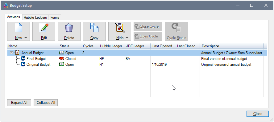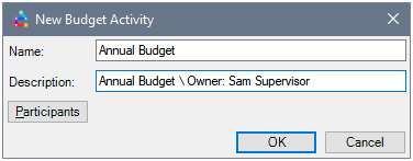 A Budget Activity defines the type of budget or forecast to be carried out, e.g. an Annual Budget or Sales Forecast. Each activity has a set of participants and is comprised of one or more cycles. The cycles, in turn, represent iterations of the activity, typically over the course of a year. A typical budget activity may consist of many participants and multiple cycles. Budget activities should be made as generic as possible, so they can be recycled each year.