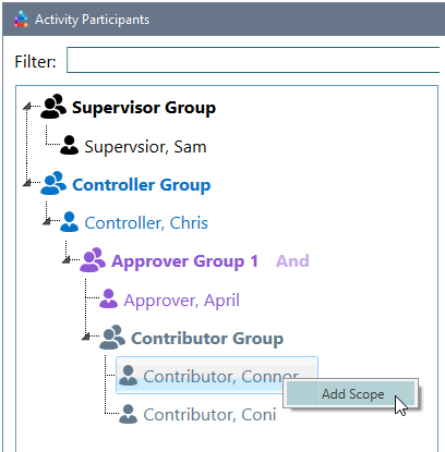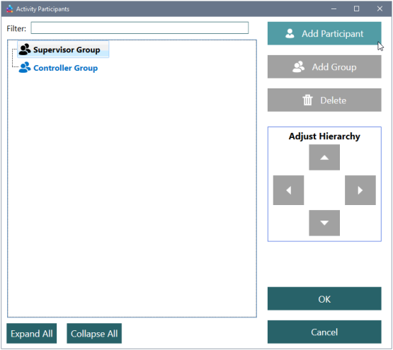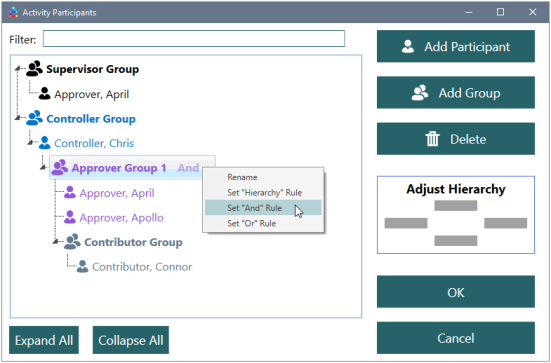 To add an approver group using the “Add Participant” Method, select the Add Participant button when a controller is selected. This will automatically create an approver group and give it the “and” rule by default. Any participants selected in the Add Participants window will be added to this group.