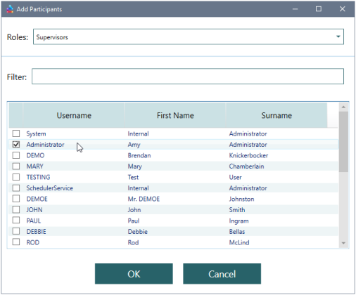If participants have already been added and you do not see them when you first go into this dialog, expand a group or click Expand All to view them. There is also username filter on this window which allows you to filter through longer participant trees.