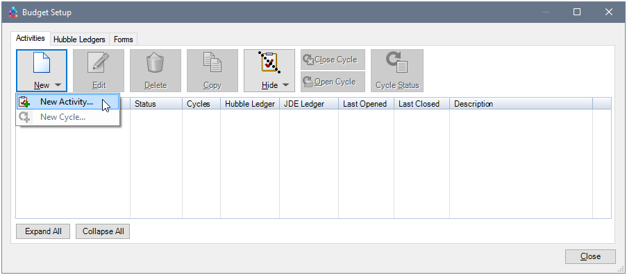 The Activities tab allows Budget Administrators and Supervisors to manage Budgeting Activities and their associated Cycles. The tab is accessed by selecting Activities from the Budgeting Menu or selecting the Activities tab from the Budget Setup dialog. From this screen Activities and Cycles can be created, copied, edited, or deleted.