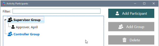 - To add participants to the supervisor group, a controller group, an approver group, or a contributor group, select the parent group and click the Add Participant to display the Add Participants window.