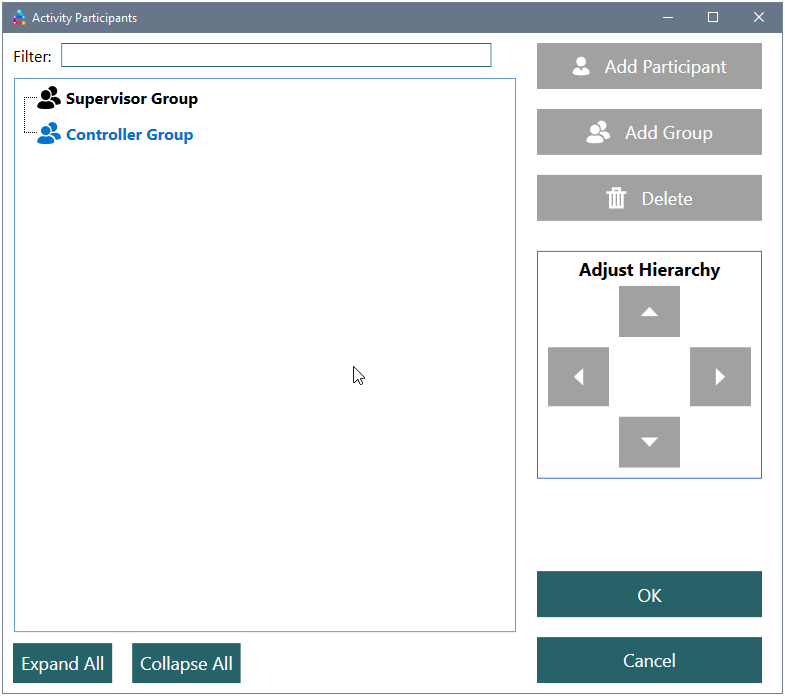 The Supervisor Group and Controller Group nodes of the tree are automatically included on a blank participant tree so that a user may add participants to the relevant group.