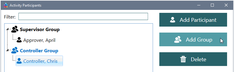 Like the Add Participant method, you must add at least one Controller before adding an Approval Group.